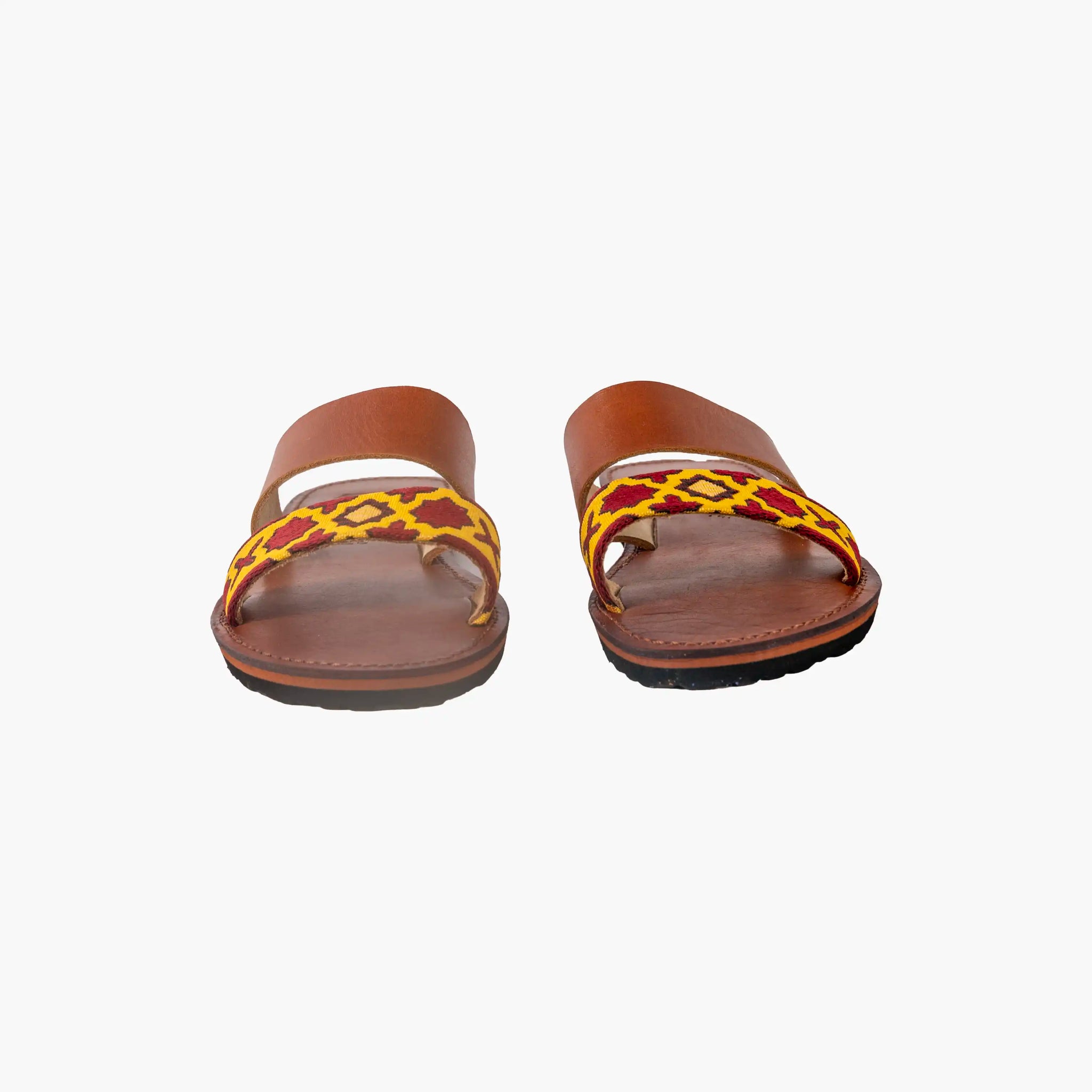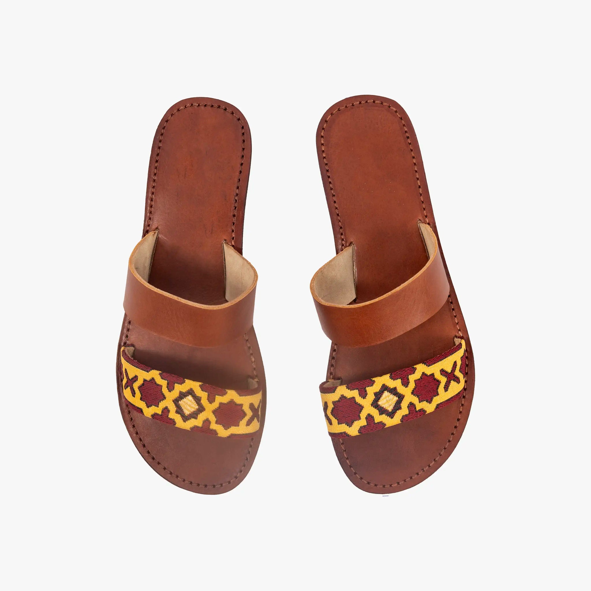 Add a touch of cultural elegance to your wardrobe with our Handmade Moroccan Embroidered Yellow & Dark Red Two-Strap Leather Sandals. Featuring a classic open-toe silhouette, these sandals combine smooth brown Moroccan leather with a boldly embroidered lower strap showcasing traditional geometric motifs in vibrant yellow and deep red. Finished with a flat sole and artisan-stamped leather footbed, they bring together authentic craftsmanship, comfort, and standout design for everyday wear.